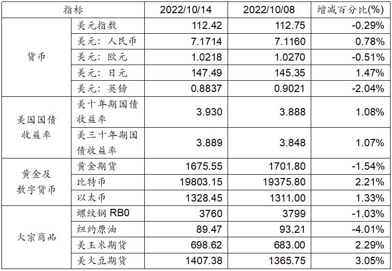 10月8日至10月14日,美元指數下降0.29%,而對其他全球主流貨幣匯率則互有漲跌。美國十年期及三十年國債收益率持續攀升,且仍然維持倒掛現象。黃金期貨價格下降,而比特幣和以太幣則分別錄得2.21%和1.33%的上漲表現。大宗商品當中,螺紋鋼和紐約原油價格下跌,而玉米和大豆期貨價格呈現上漲。