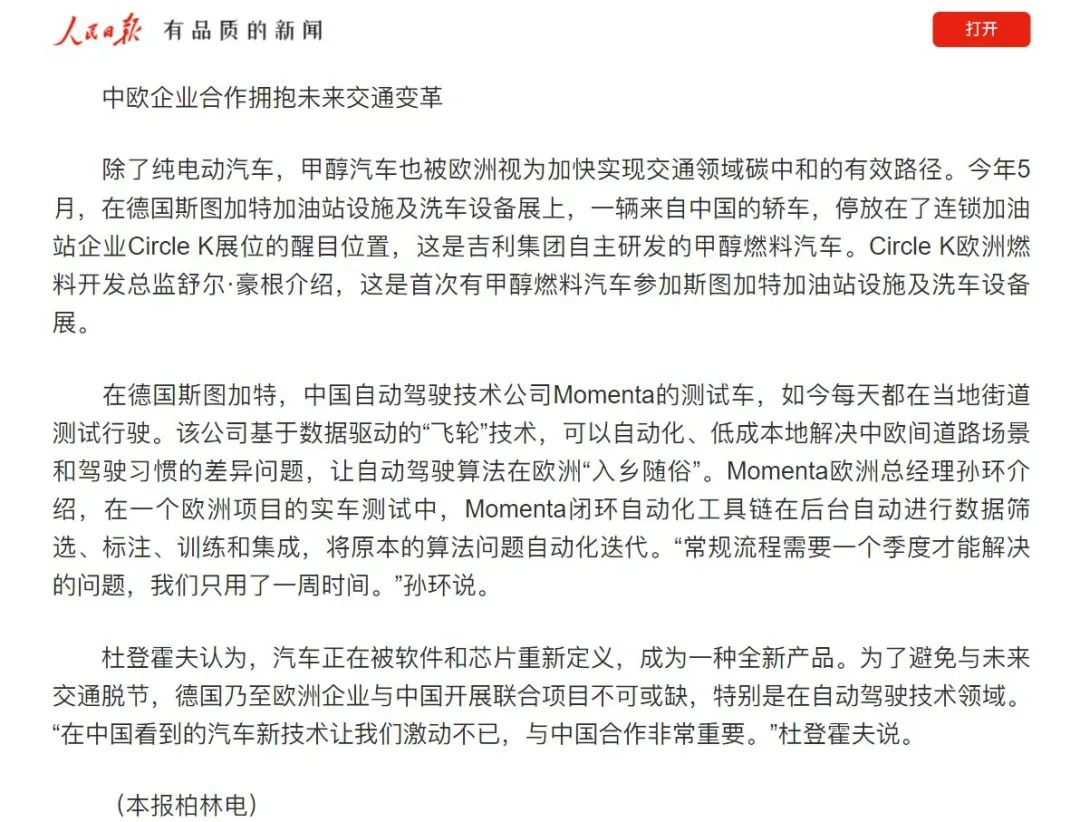 10月17日,《人民日報》國際版面刊發(fā)的“中國新能源汽車積極拓展歐洲市場”一文中,Momenta獨特的數(shù)據(jù)驅(qū)動“飛輪”技術(shù)路徑以及在歐洲市場取得的成績獲得《人民日報》關(guān)注報道。