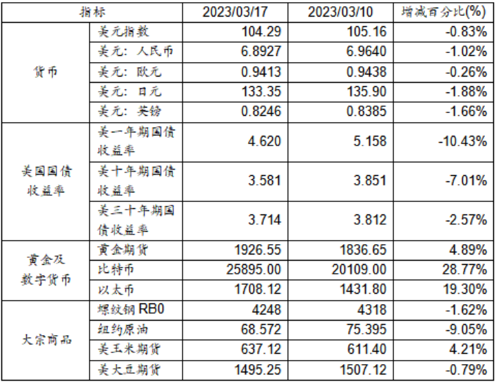 3月10日至3月17日,美元指數下跌0.83%,美元兌人民幣匯率下跌1.02%達到1:6.8927。美國一年期、十年期以及三十年其國債收益率均出現下跌。黃金期貨價格上漲4.89%。比特幣大漲28.77%。以太幣大漲19.30%。大宗商品中,螺紋鋼、紐約原油及大豆期貨價格均呈現下跌態勢,而玉米期貨價格則呈現上漲。