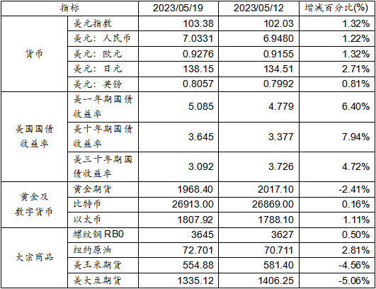 5月12日至5月19日,美元指數(shù)上漲1.32%,美元兌人民幣匯率上漲1.22%達(dá)到1:7.0331。美國一年期、三年期以及五年期國債收益率均呈現(xiàn)上漲態(tài)勢。黃金期貨價(jià)格下跌2.41%。比特幣上漲0.16%。以太幣上漲1.11%。大宗商品中,螺紋鋼和紐約原油價(jià)格上漲,而大豆期貨及玉米期貨價(jià)格則呈現(xiàn)下跌態(tài)勢。