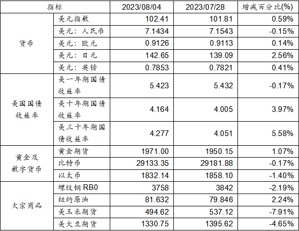 7月28日至8月4日,美元指數上漲0.59%,美元兌人民幣匯率下跌0.15%達到1:7.1434。美國一年期下跌,而十年期、三十年其國債收益率則呈現上漲態勢。黃金期貨價格上漲1.07%。比特幣下跌0.17%。以太幣下跌1.40%。大宗商品中,紐約原油價格持續上漲,而螺紋鋼、玉米期貨及大豆期貨價格則出現下跌態勢。