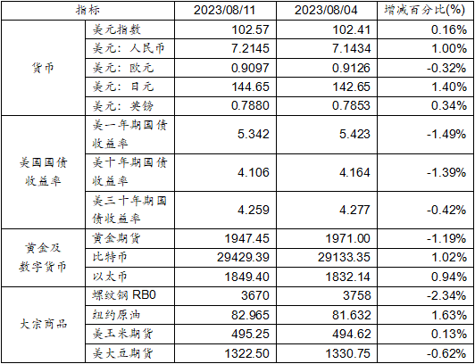 8月4日至8月11日,美元指數上漲0.16%,美元兌人民幣匯率上漲1.00%達到1:7.2145。美國一年期、十年期以及三十年其國債收益率均出現下跌。黃金期貨價格下跌1.19%。比特幣上漲1.02%。以太幣上漲0.94%。大宗商品中,螺紋鋼及大豆期貨價格出現下跌,而紐約原油及玉米期貨價格則呈現上漲。
