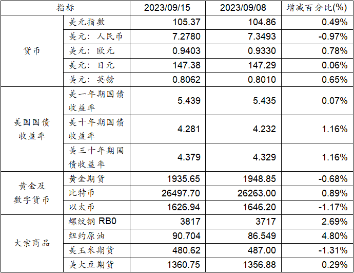9月8日至9月15日,美元指數上漲0.49%,美元兌人民幣匯率下跌0.97%達到1:7.2780。美國一年期、十年期及三十年期國債收益率均出現上漲。黃金期貨價格下跌0.68%。比特幣上漲0.89%。以太幣下跌1.17%。大宗商品中,螺紋鋼、紐約原油及大豆期貨價格上漲,而玉米期貨價格下跌。