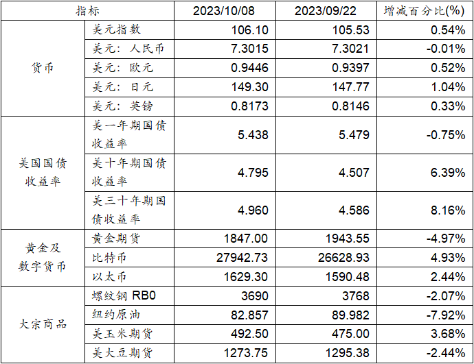 9月22日至10月8日,美元指數(shù)上漲0.54%,美元兌人民幣匯率下降0.01%達(dá)到1:7.3015。美國一年期國債收益率下降,而十年期及三十年期國債收益率則出現(xiàn)上漲。黃金期貨價(jià)格下跌4.97%。比特幣上漲4.93%。以太幣上漲2.44%。大宗商品中,玉米期貨價(jià)格上漲,而螺紋鋼、紐約原油及大豆期貨價(jià)格均出現(xiàn)下跌。