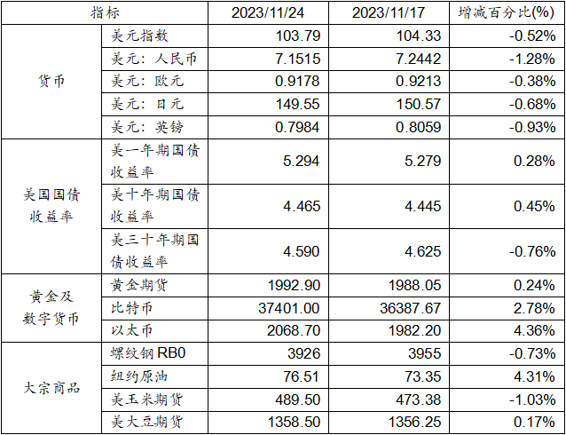 11月17日至11月24日,美元指數(shù)下跌0.52%,美元兌人民幣匯率下跌1.28%達到1:7.1515。美國一年期及十年期國債收益率上升,而三十年國債收益率下跌。黃金期貨價格上漲0.24%。比特幣上漲2.78%。以太幣上漲4.36%。大宗商品中,螺紋鋼及玉米期貨價格下跌,而紐約原油及大豆期貨價格出現(xiàn)上漲。