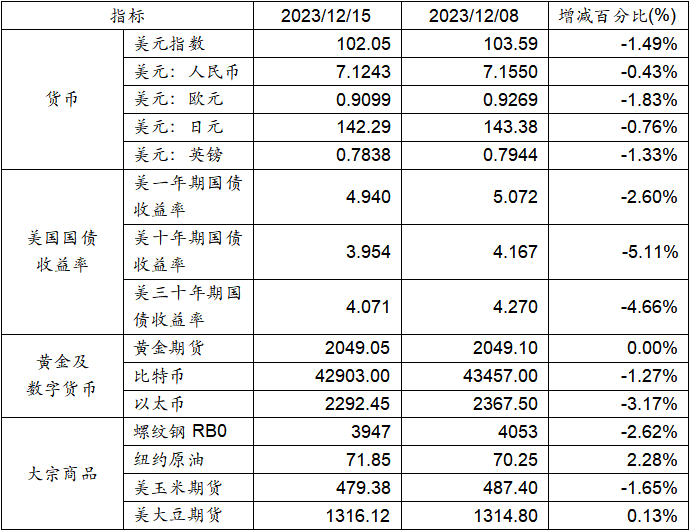 12月8日至12月15日,美元指數下跌1.49%,美元兌人民幣匯率下跌0.43%達到1:7.1550。美國一年期、十年期及三十年期國債收益率均下跌。黃金期貨價格基本不變。比特幣下跌1.27%。以太幣下跌3.17%。大宗商品中,螺紋鋼、玉米期貨價格下跌,而紐約原油及大豆期貨價格則呈現上漲。