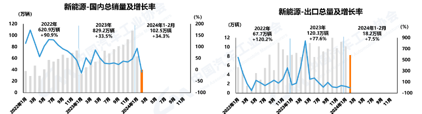 1-2月,新能源汽車產銷分別完成125.2萬輛和120.7萬輛,同比分別增長28.2%和29.4%,市場占有率約30%。其中,國內銷量102.5萬輛,同比增長34.3%,出口18.2萬輛,同比增長7.5%。