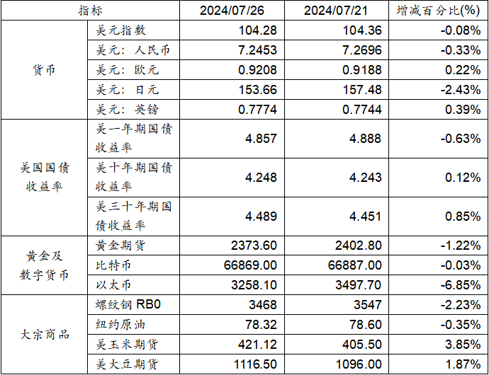 7月21日至7月26日,美元指數(shù)下跌0.08%,美元兌人民幣匯率下跌0.33%至1:7.2453。美國一年期國債收益率下跌,而十年期及三十年期國債收益率均呈現(xiàn)上漲態(tài)勢。黃金期貨價格下跌1.22%。比特幣下跌0.03%。以太幣下跌6.85%。大宗商品中,玉米期貨及大豆期貨價格上漲,而螺紋鋼及紐約原油價格均呈現(xiàn)下跌態(tài)勢。