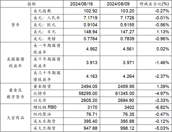 8月9日至8月16日,美元指數(shù)下跌0.27%,美元兌人民幣匯率下跌0.01%至1:7.1719。美國一年期國債收益率小幅上升,而十年期及三十年期國債收益率呈現(xiàn)下跌態(tài)勢。黃金期貨價格上漲1.39%。比特幣下跌4.97%。以太幣下跌3.33%。大宗商品中玉米期貨、大豆期貨、螺紋鋼及紐約原油價格均呈現(xiàn)下跌態(tài)勢。