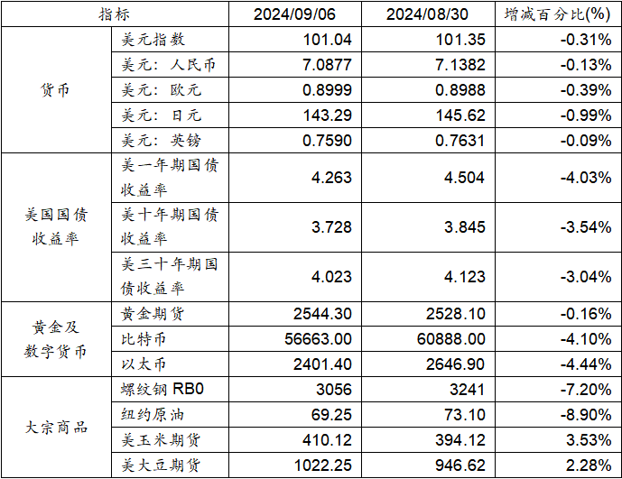 8月30日至9月6日,美元指數下跌0.31%,美元兌人民幣匯率下跌0.13%至1:7.0877。美國一年期、十年期及三十年其國債收益率均呈現下跌態勢。黃金期貨價格下跌0.16%。比特幣下跌4.10%。以太幣下跌4.44%。大宗商品中螺紋鋼及紐約原油價格下跌,而玉米期貨及大豆期貨價格均呈現上漲態勢。