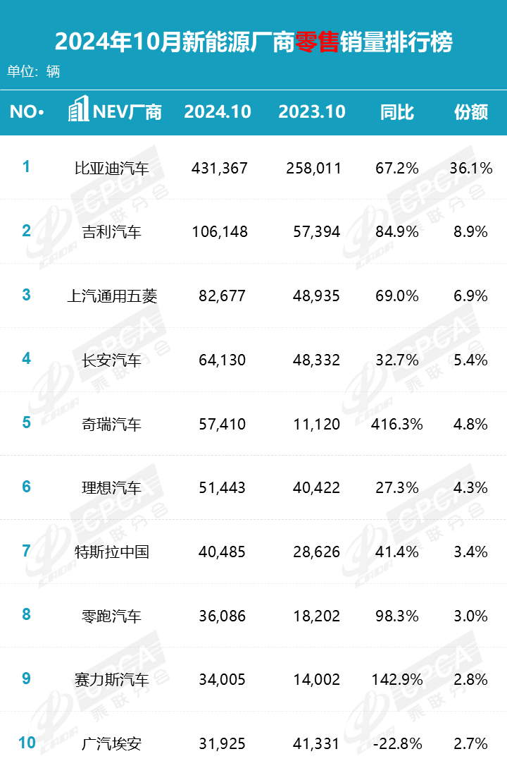 部分新能源廠商具體零售銷量如下: