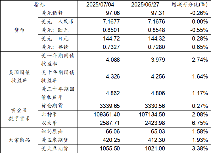 6月27日至7月4日,美元指數(shù)下跌0.26%,美元兌人民幣匯率基本不變。美國(guó)一年期十年期及三十年期國(guó)債收益率均呈現(xiàn)上漲態(tài)勢(shì)。黃金期貨價(jià)格上漲0.27%。比特幣上漲2.08%。以太幣上漲6.75%。大宗商品中紐約原油、玉米期貨及大豆期貨價(jià)格均呈現(xiàn)上漲態(tài)勢(shì)。