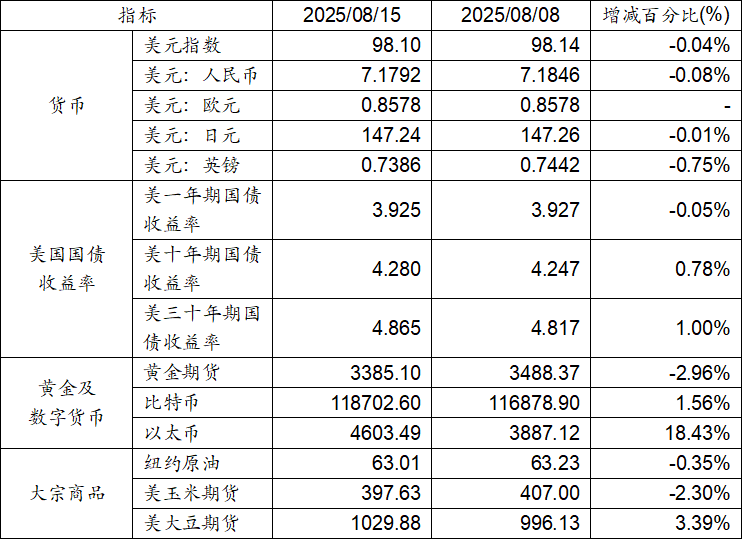 8月7日至8月15日,美元指數(shù)下跌0.04%,美元兌人民幣匯率下跌0.08%。美國一年期國債收益率下跌,而十年期及三十年期國債收益率則呈現(xiàn)上漲態(tài)勢。黃金期貨價(jià)格下跌2.96%。比特幣上漲1.56%。以太幣上漲18.43%。大宗商品紐約原油及 玉米期貨價(jià)格下降,而大豆期貨價(jià)格則呈現(xiàn)上漲態(tài)勢。