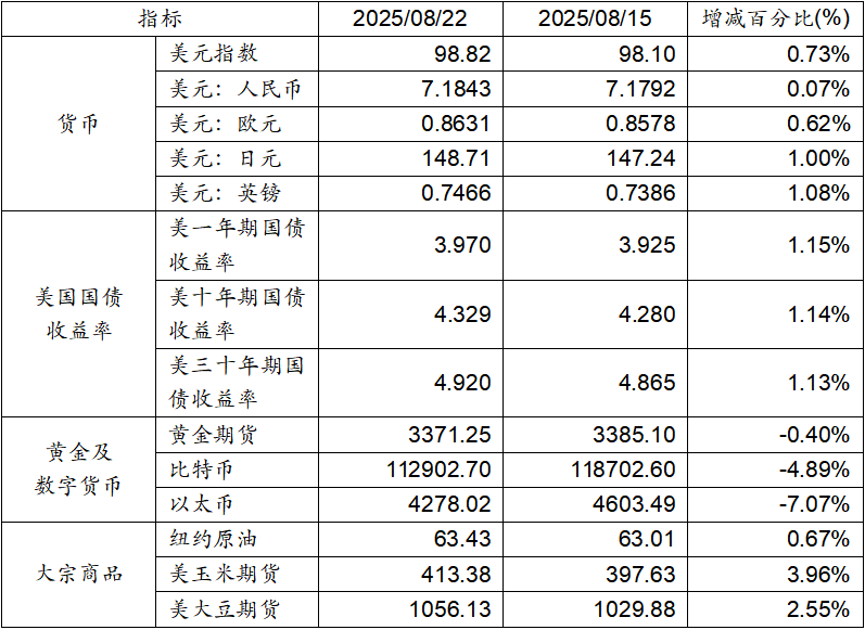 8月15日至8月22日,美元指數上漲0.73%,美元兌人民幣匯率上漲0.07%。美國一年期、十年期及三十年期國債收益率均呈現上漲態勢。黃金期貨價格下跌0.40%。比特幣下跌4.89%。以太幣下跌7.07%。大宗商品紐約原油、玉米期貨及大豆期貨價格均呈現上漲態勢。