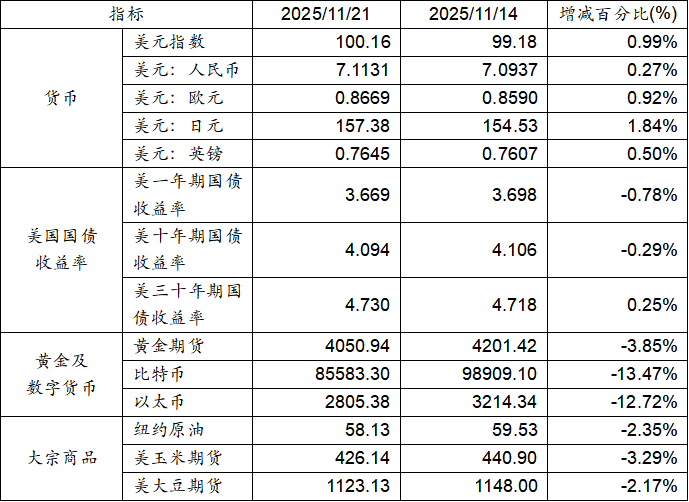 11月14日至11月21日,美元指數(shù)上漲0.99%,美元兌人民幣匯率上漲0.27%。美國一年期及十年期國債收益率下跌,而三十年期國債收益率呈現(xiàn)上漲態(tài)勢。黃金期貨價(jià)格下跌3.85%。比特幣下跌13.47%。以太幣下跌12.72%。大宗商品中紐約原油、玉米期貨及大豆期貨價(jià)格均呈現(xiàn)下跌態(tài)勢。