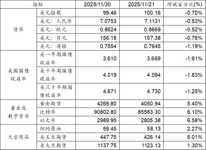 11月21日至11月30日,美元指數下跌0.70%,美元兌人民幣匯率下跌0.53%。美國一年期、十年期及三十年期國債收益率均下跌。黃金期貨價格上漲5.40%。比特幣上漲6.10%。以太幣上漲6.58%。大宗商品中紐約原油、玉米期貨及大豆期貨價格均呈現上漲態勢。