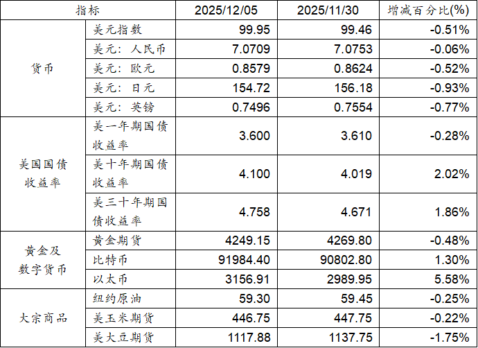 11月30日至12月05日,美元指數下跌0.51%,美元兌人民幣匯率下跌0.06%。美國一年期國債收益率下跌,而十年期及三十年期國債收益率呈現上漲態勢。黃金期貨價格下跌0.48%。比特幣上漲1.30%。以太幣上漲5.58%。大宗商品中紐約原油、玉米期貨及大豆期貨價格均呈現下跌態勢