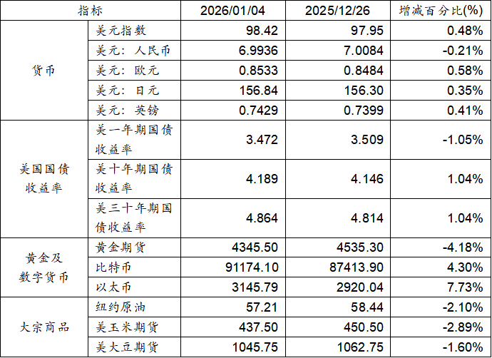 2025年12月26日至2026年1月4日,美元指數上漲0.48%,美元兌人民幣匯率下跌0.21%。美國一年期國債收益率下跌,而十年期及三十年期國債收益率則實現上漲。黃金期貨價格下跌4.18%。比特幣上漲4.30%。以太上漲7.73%。大宗商品中紐約原油、玉米期貨及大豆期貨價格均呈現下跌態勢。