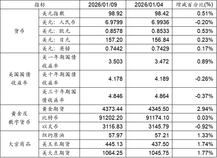 1月4日至1月9日,美元指數上漲0.51%,美元兌人民幣匯率下跌0.20%。美國一年期國債收益率上漲,而十年期及三十年期國債收益率則實現下跌。黃金期貨價格上漲2.94%。比特幣上漲0.03%。以太下跌0.92%。大宗商品中紐約原油、玉米期貨及大豆期貨價格均呈現上漲態勢。