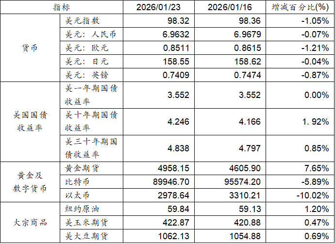 1月16日至1月23日,美元指數上漲0.44%,美元兌人民幣匯率下跌0.07%。美國十年期及三十年期國債收益率均實現上漲。黃金期貨價格上漲7.65%。比特幣下跌5.89%。以太幣下跌10.02%。大宗商品中紐約原油、玉米期貨及大豆期貨價格均呈現上升態勢。