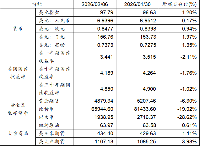 1月30日至2月6日,美元指數上漲1.20%,美元兌人民幣匯率下跌0.17%。美國一年期、十年期及三十年期國債收益率均下跌。黃金期貨價格下跌6.30%。比特幣下跌19.02%。以太幣下跌28.62%。大宗商品中紐約原油、玉米期貨及大豆期貨價格均呈現上升態勢。