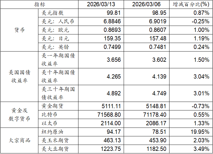 3月6日至3月13日,美元指數(shù)上漲0.87%,美元兌人民幣匯率下跌0.25%。美國(guó)一年期、十年期及三十年期國(guó)債收益率均出現(xiàn)上漲。黃金期貨價(jià)格下跌0.73%。比特幣上漲0.55%。以太幣上漲1.33%。大宗商品中紐約原油、玉米期貨及大豆期貨價(jià)格均呈現(xiàn)上升態(tài)勢(shì)。