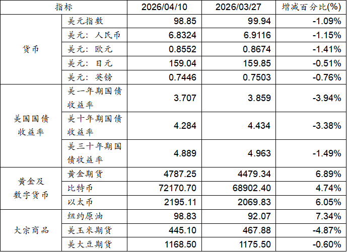 3月27日至4月10日,美元指數下跌1.09%,美元兌人民幣匯率下跌1.15%。美國一年期、十年期及三十年期國債收益率均有所下跌。黃金期貨價格上漲 6.89%。比特幣上漲 4.74%。以太幣上漲 6.05%。大宗商品中紐約原油價格上漲,而玉米期貨和大豆期貨價格呈現下跌態勢。